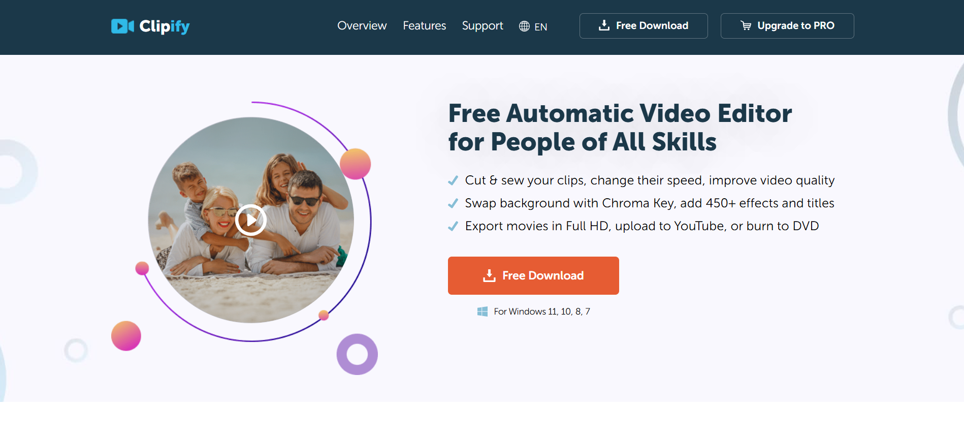 Clipify aims for simplicity with timeline editing, quick stabilization, chroma keying, and various export options. It specifically targets older Windows versions and low-RAM machines.It offers automatic assembly features and templates to help speed up production. While some features might only be available in paid tiers, the basic product works well on computers that most modern editors would avoid.
